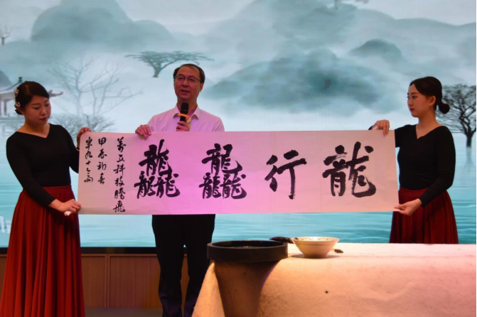 贠总在现场挥毫泼墨,写下了“龙行龘龘”四个大字,寓意着万立园区在新的一年里能够聚力腾飞,取得更加辉煌的成就。蔺总监则为大家带来了九节鞭表演,他的技艺炉火纯青,再一次点燃了现场的气氛。