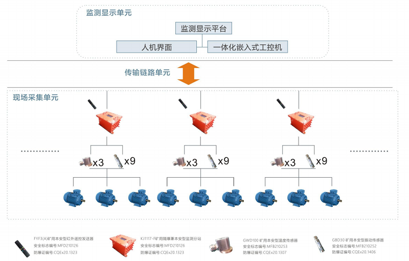 KJ1117煤矿电机温度振动系统是本公司自主研发,用于监测大,中,小型机电设备的运行状态的系统。系统可以实时进行数据采集、保存、智能诊断出设备状态,最大限度的降低故障率,实现煤矿大型电机设备科学化,规范化、系统化、信息化的管理需求,为应急控制和维修管理提供准确、可靠依据,在节约维修费用的同时,避免重大事故的发生。该系统是各工矿企业进行远程机电设备运行状态监测的专用设备,可在矿上,化工等有大量电机存在的场合广泛使用。