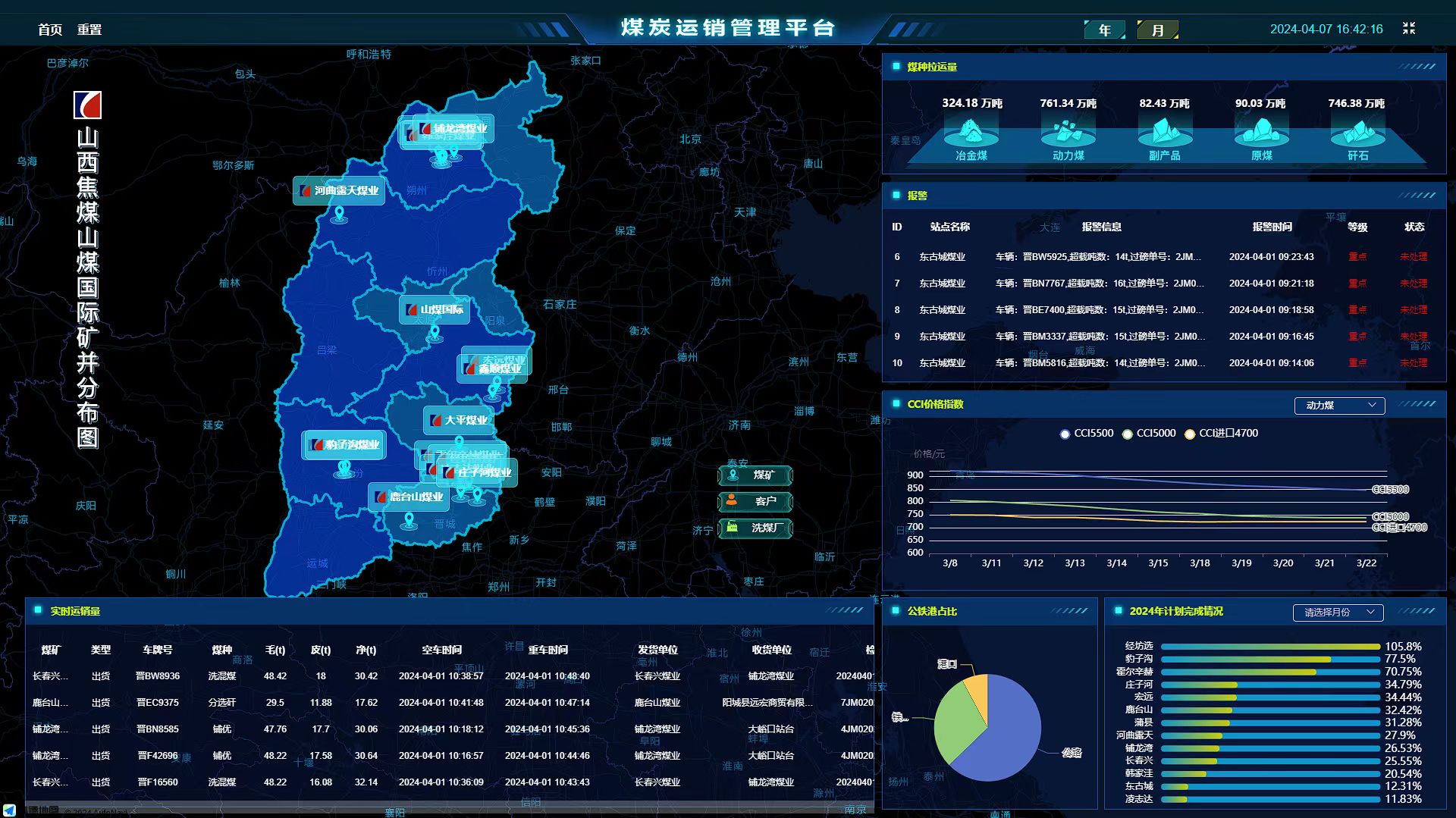 数据大屏以图表、地图、数据等形式,实时展示煤种拉运量、报警、CCI价格指数、公铁港销售占比、年度计划完成情况、实时运销量列表及地图等功能模块,便于用户进行全面的数据监控和决策分析;
