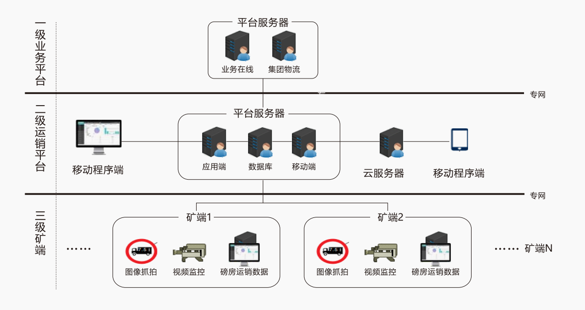 煤炭运销管理平台链路主要由集团业务(一级业务平台)、煤炭运销(二级运销平台)、矿端运销(三级矿端)构成,包含电脑web端、移动小程序端两级服务端,主要包括合同管理、调运管理、磅房数据管理、报表管理等数百个运销管控功能,通过大数据信息整合,打通人、货、车三方信息通道形成煤炭物流生态链。