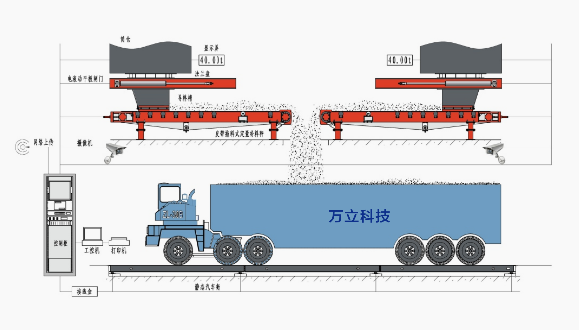 该系统是在不改变原有筒仓结构的情况下,在筒仓口下方地面上直接安装汽车衡,通过控制现有筒仓下料装置,实现快速定量装车。该系统主要由称重系统、计算机定值管理系统、红外车辆分离系统、车辆轮轴识别系统等部分组成。