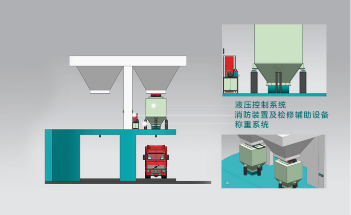 该系统由PLC控制,设手动、自动两种控制方式。料斗秤快速定量仓与筒仓仓口通过柔性连接,在筒仓仓口设置平板闸门控制下料。定量仓由四个称重传感器支撑,并设有校正码装置,方便对定量仓进行计量校验。定量仓下料口通过装车溜槽对火车、汽车进行快速定量装车,同时完成对车厢的平煤工作。系统包括称重系统、装车漏斗及闸门装置、液压系统、控制系统,供电照明系统、消防装置检修设备及其他辅助设备设施等。